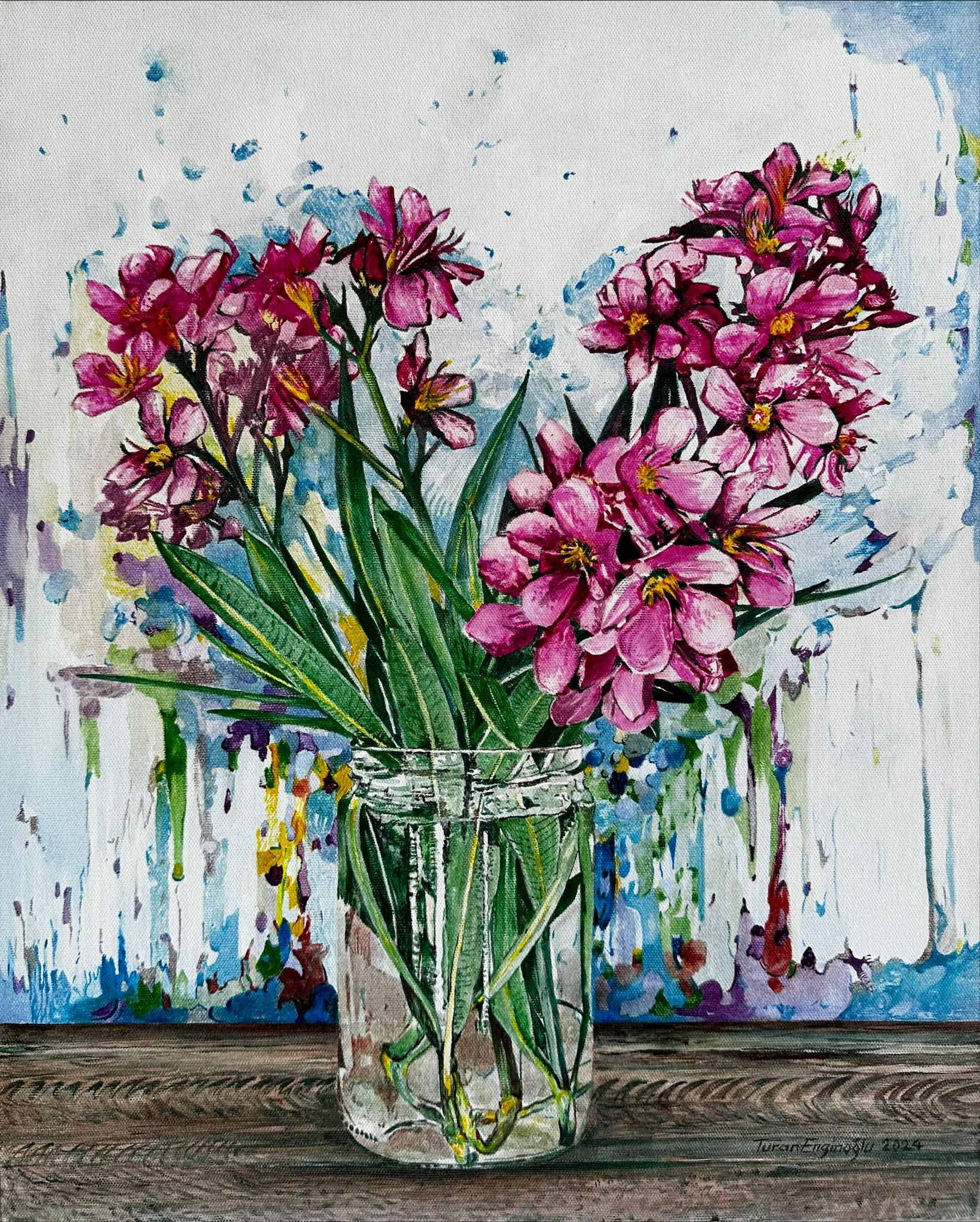 Turan Enginoğlu, “Kavanozda zakkumlar”, tuval üzerine akrilik+yağlıboya, 40 cm X 50 cm, yapım tarihi: 21.08.2024. Bu resim CMY renkleriyle yapılmıştır.